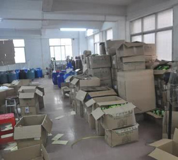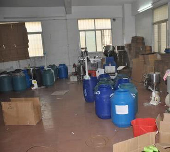 现场,生产窝点房间内布满了灰尘,地板上摆放着大量废旧塑料桶,桶内堆放着化妆品原料,空气中弥漫着各种气味。房间的另一角落摆放着液体灌装机、封口机、塑封机等生产设备,其中灌装机塑料软管内正连接着塑料桶的透明液体,塑封机仍在高温状态中。