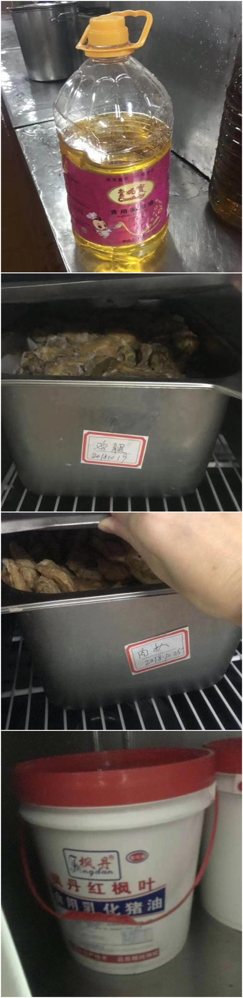 据学校家长介绍,10月29日,家长进校帮忙布置万圣节活动的场地,因为近期其他学校发生的食品安全事件,家长便到食堂里去了解情况,但家长在后厨冷冻柜里发现了时间标签为10月19日的熟食鸡腿和10月25日的肉排;食堂食用油品牌为金妮宝,在网上查询发现,该食用油品牌曾在2013年产品质检不合格,且食堂还有不知名的乳化猪油。