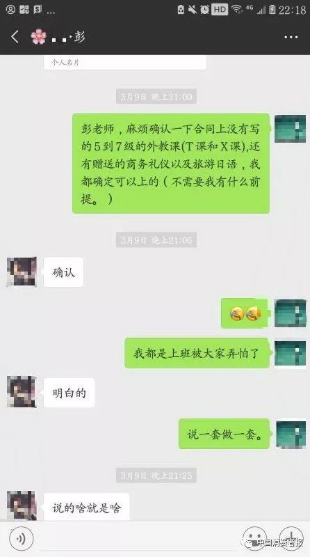为了确定口头约定的课程都可以上课,梁小姐在微信上与销售人员彭某进行了确认。在梁小姐提供的截图上,记者看到她询问是不是可以正常上合同上没有写的5级—7级的外教课,并且没有什么前提,对方回答是“确认”。