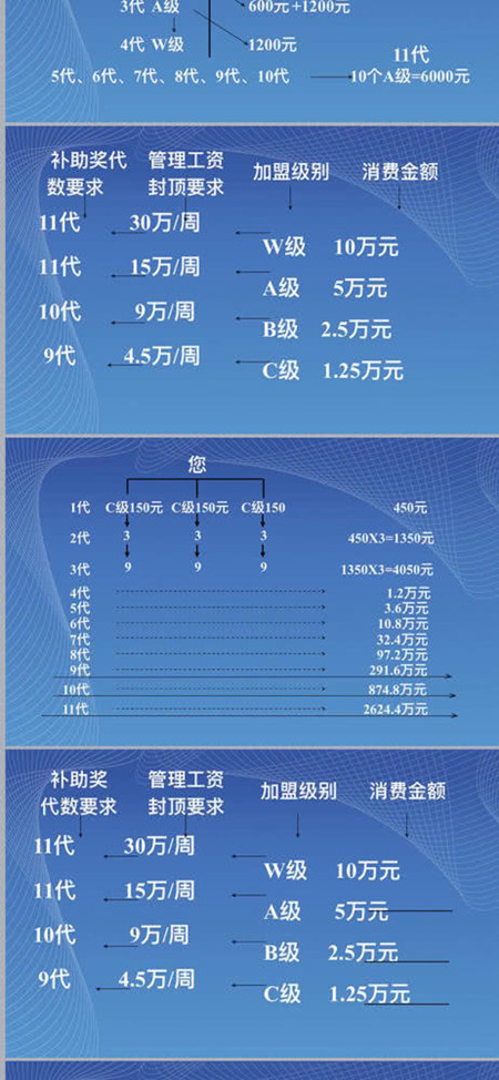 记者获得的一份河北华林公司内部培训文件显示,该公司加盟级别分为4级,分为W、A、B、C级,分别对应的消费金额为10万元、5万元、2.5万元和1.25万元,即交钱交到上述对应数额才能达到对应的加盟级别。