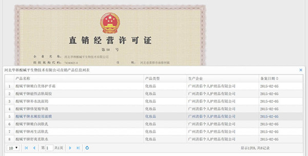 记者在商务部官网上查询到,获得直销牌照的河北华林酸碱平生物技术有限公司下设5个直销分支机构; 37个直销服务网点;拥有直销培训员在册1人。