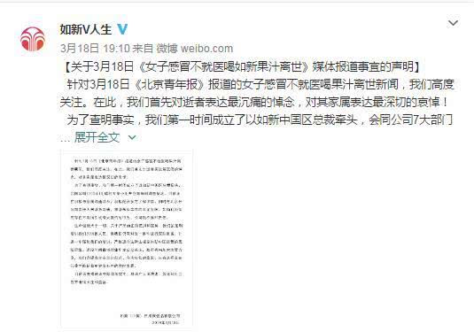 3月18日,针对“女子喝如新果汁去世”的报道,如新集团官方微博发表声明回应称,第一时间成立了以如新中国区总裁牵头,会同公司7大部门组成的专案小组并立即采取调查措施。目前正在积极与家属沟通联系,积极配合多方了解详情,同时与北京分公司责任人员紧急沟通,抓紧核实事件的来龙去脉。