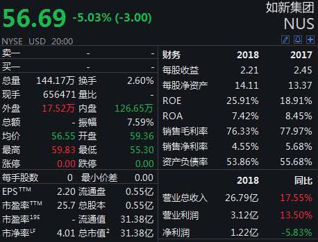 但这几年,如新业绩却持续下滑。公司2018财年全年盈利1.22亿美元,同比下降5.83%,同年第四财季首亏1775.9万美元;公司2017年财报显示,全年盈利1.29亿美元,同比下降9.54%。