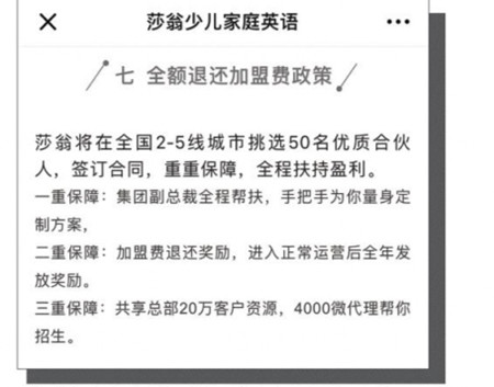 “莎翁将在全国扶持50名城市合伙人。”2018年5月27日,莎翁少儿家庭英语在微信公众号上公开发文,宣传在2-5线城市招加盟,并附有全额退还加盟费政策。