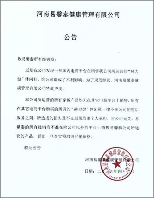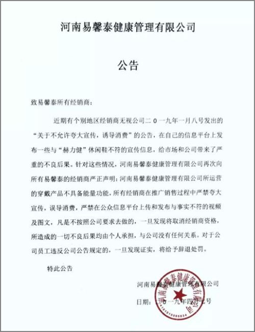 “易馨泰休闲鞋”。此外,其微信公号曾于4月7日发布公告称,“赫力健”只是一款休闲鞋,任何夸大宣传、诱导消费的行为是个别地区经销商的个人行为,与公司无任何关系,如发现经销商或公司员工违反有关规定,将取消经销商资格或给予辞退处罚。