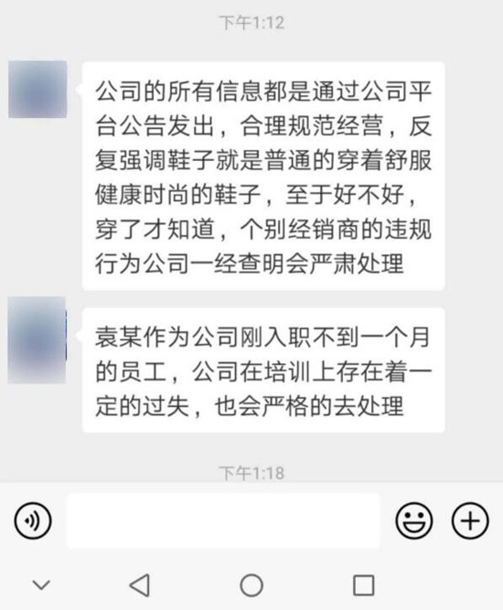 在袁某提供的微信截图中,该公司负责人回应称,公司已反复向经销商们强调,这款鞋只是一双普通的、穿着舒服的时尚健康鞋,“至于好不好,穿了才知道”,而个别经销商的违规行为一经查明将严肃处理。该负责人称,袁某只是公司刚入职不到一个月的员工,公司在培训上存在一定过失,会严格处理。