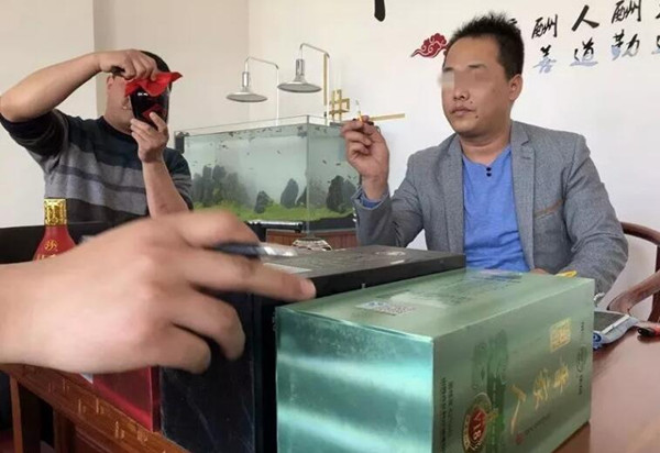 两名汾酒集团开发商在展示“开发酒”样品,并称此酒可私自灌装散酒