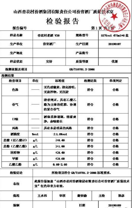 记者购买了一款名为“杏花村老酒”的汾酒集团开发酒,其酒水检验报告显示,该酒的生产单位为汾青酒厂,但未标注生产地址和产品批号。在这份检验报告中,还盖有“山西杏花村汾酒集团有限责任公司汾青酒厂质量技术室”的红色章印。