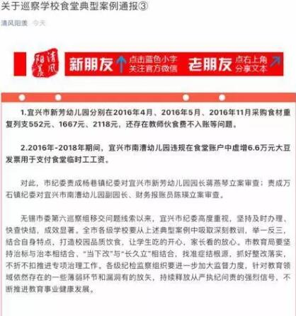 因存在几次采购食材重复列支以及教师伙食费不入账等问题,江苏宜兴一所幼儿园的园长被立案审查。这是中共宜兴市纪律检查委员会4月24日一早发布的《关于巡察学校食堂典型案例通报》(下简称《通报》)中提到的内容。