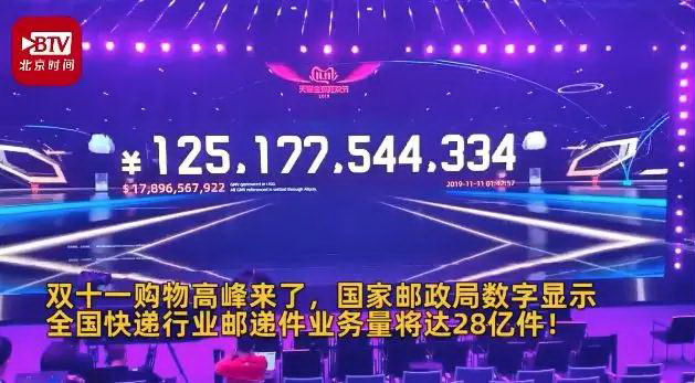 11月11日,10小时4分49秒,2019天猫双11成交额超2017年双11全天。此前11月5日,国家邮政局发布今年前三季度邮政行业经济运行情况。预计双十一期间快件量将达28亿件,210万名一线快递员平均每人每天要送240多件快递,日均处理量将达3.5亿件。
