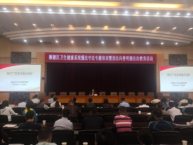 今年以来,顺德区医疗机构宣传成为被投诉举报的热点。为有效规范辖区医疗机构的广告发布行为,进一步提高医疗机构的法律意识,11月22日上午,佛山市顺德区市场监管局在区卫健局组织举办的医疗机构懂法、守法专题培训班暨崇法向善明德法治教育活动中,对辖区的公营、民营医院,社区卫生服务中心等医疗机构单位开展广告宣传培训。上述医疗机构的分管领导、宣传负责人等共130人参加了培训会议。